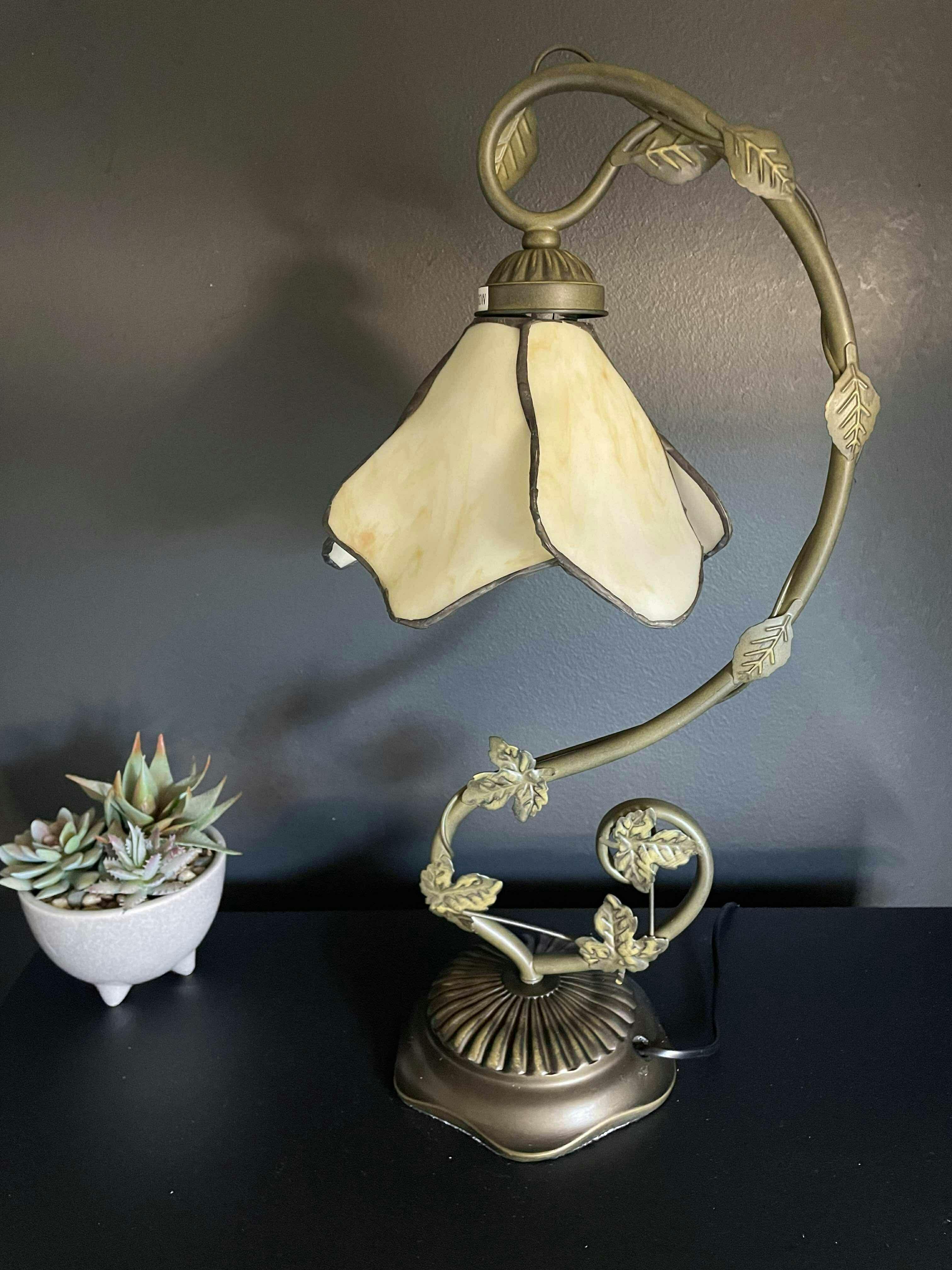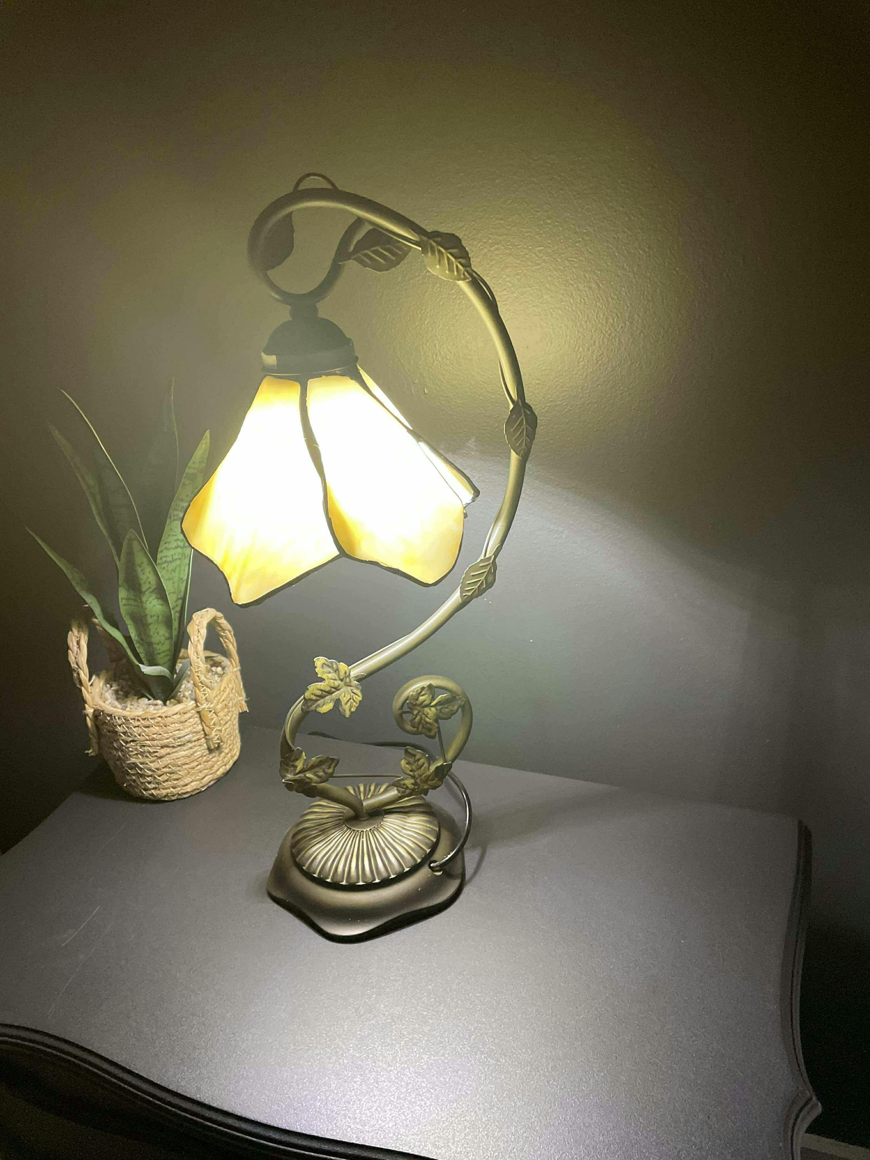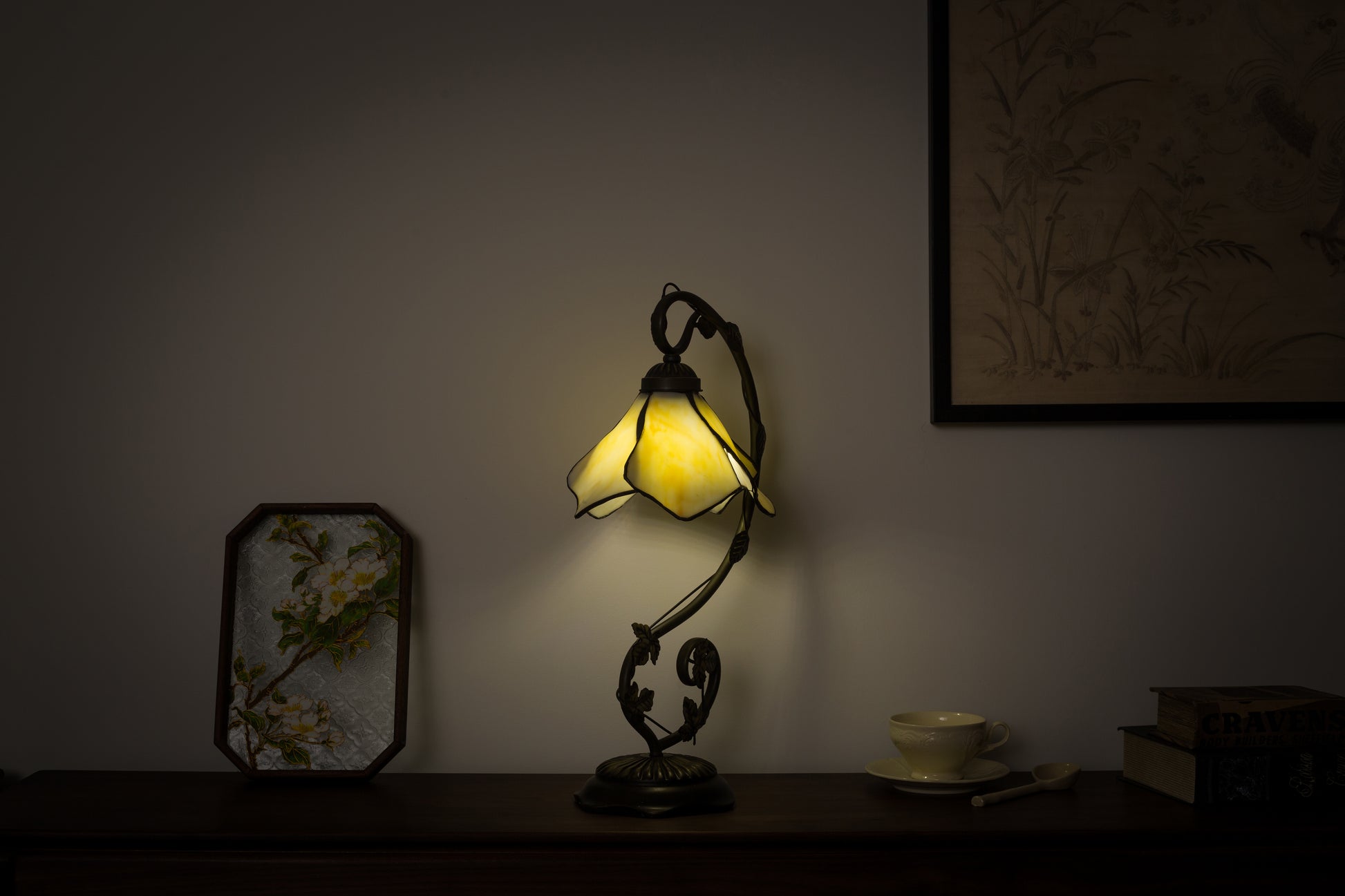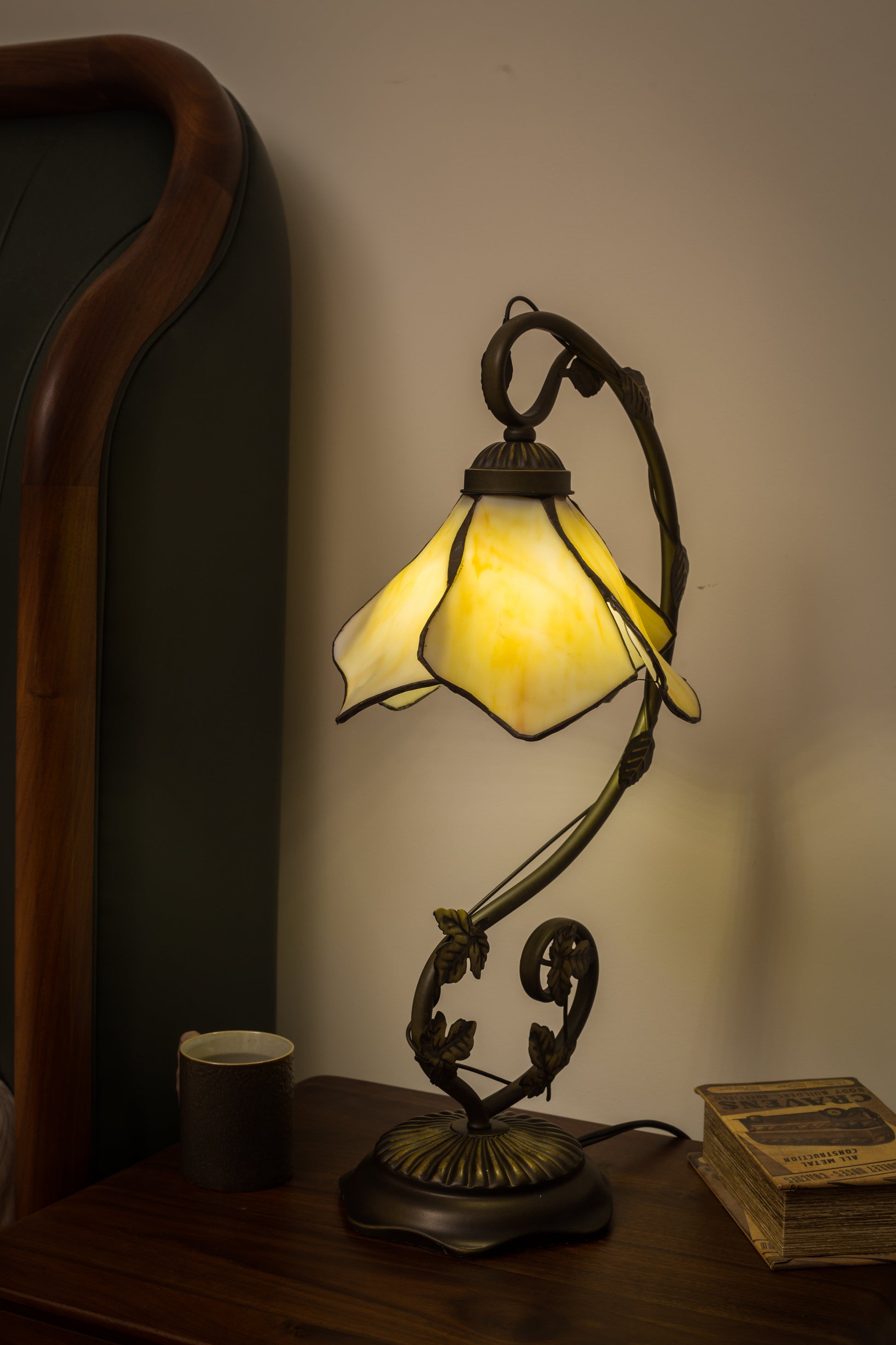 The Flora Tiffany Style Lamp blends vintage charm and soft elegance with hand-cut stained glass petals, casting a gentle, magical glow.